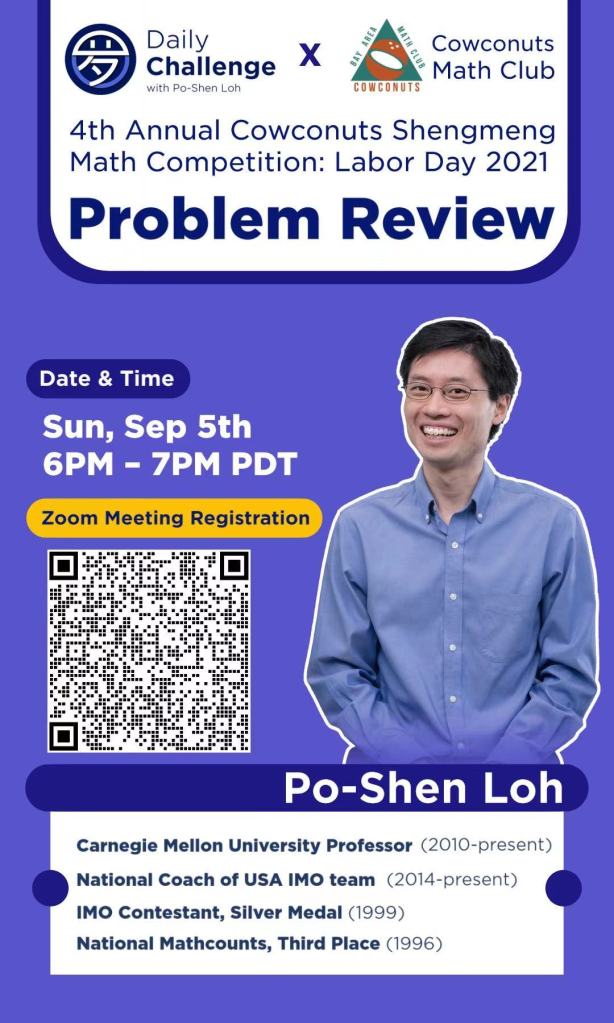 We are happy to announce that the 4th Annual Cowconuts Shengmeng Math Competition is sponsored by Daily Challenge with Po-Shen Loh! Prof. Loh will be doing a live talk, in which he will solve some of the most interesting problems in this contest. We highly recommend that you attend this informative live talk since Prof. Loh’s previous live talks were all very inspiring and innovative. Thanks for your participation and we hope to see you there!